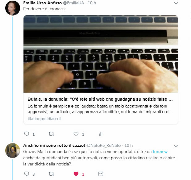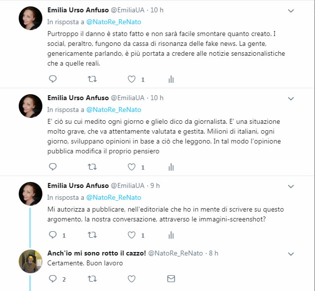 Un’educata conversazione che ho avuto oggi su Twitter – sottolineo la parola educata dal momento che sta diventando roba rara – mi ha permesso di riflettere ulteriormente sul tema della crisi del giornalismo, legata - essenzialmente - alla diffusione dell’informazione sul web. Quando, esattamente 13 anni fa, ebbi l’idea di fondare questo quotidiano che mi onoro di dirigere, dissi una cosa: “Il web causerà disastri al settore del giornalismo. Tutti potranno diffondere informazioni, e questo provocherà certamente un caos epocale, in quanto chiunque – dotato i PC e connessione al web – sarà in grado di aprire un sito e pubblicare qualsiasi cosa gli passi per la testa”. So che, spesso, devo avere la pazienza di attendere che le cose, che immagino anzitempo, accadano. Le Cassandra devono sviluppare questa capacità, altrimenti rischiano di impazzire. Eccoci al caos epocale e siamo già a un punto di non ritorno. Utilizzerò lo scambio di opinioni, avvenuto stamane, con un signore che – su Twitter – aveva pubblicato quella che, a tutti gli effetti, appare essere una notizia quantomeno bizzarra. Ho chiesto, e ottenuto, la sua autorizzazione a pubblicare gli screenshot della nostra conversazione: anche così si esce dalla crisi del giornalismo, lavorando in maniera onesta e trasparente. Ecco la chiacchierata in questione: