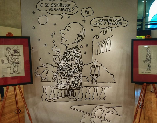 (Foto di Emanuele Giampaolo) Poi sopravviene il disegnatore, che, varcata la soglia della mostra, si lascia sopraffare da quella linea netta, marcata come poche, che non lascia indifferente. Da quel fumetto, irriverente, disegnato e sfumato senza bozza e per di più a pennarello e volare con la fantasia, è un passo davvero breve. Non puoi non guardare, con gli occhi dell’amore o dell’ammirazione un talento allo stato brado, che come tale va lasciato a briglia sciolta.