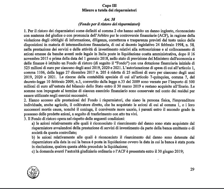 Proseguiamo. Ricordate il “Fondo ristoro per il ristoro dei risparmiatori”? E’ un fondo creato per restituire, almeno in parte, il denaro sottratto ai risparmiatori caduti nella tragedia del crac delle banche come la Etruria. Ebbene, da questo fondo – che era originariamente di 525 milioni di euro per ciascuno degli anni 2019, 2020 e 2021 – sono stati tolti 25 milioni per ciascun anno. Un brutto taglio netto, soprattutto ai diritti dei risparmiatori frodati. Altro autogol del governo in carica, soprattutto per ciò che riguarda il M5S e Di Maio, che parlava di “Manovra del popolo” , ma non spiegava in che senso. Ecco l’articolo 38 del DEF sulle “Misure a tutela dei risparmiatori”:
