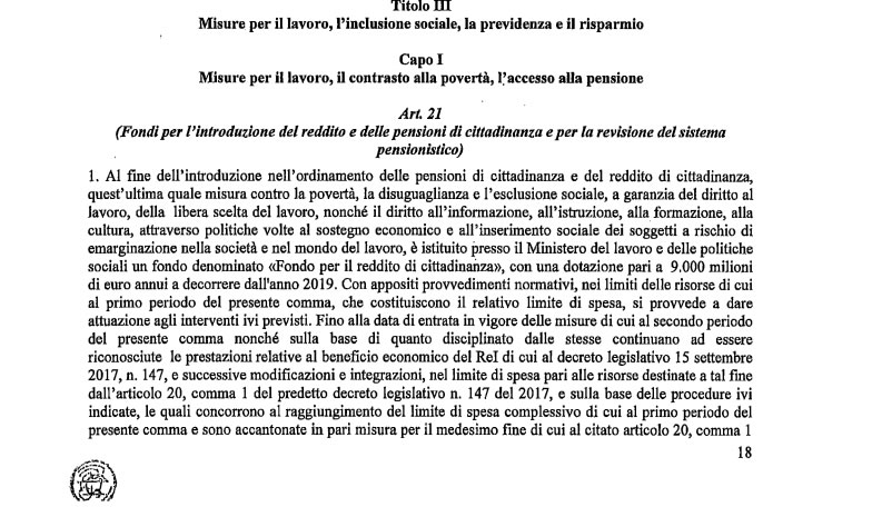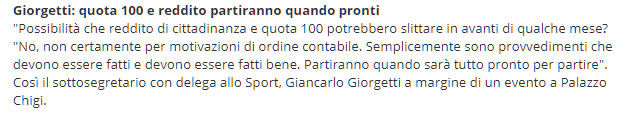Ma andiamo avanti. L’agognato “reddito di cittadinanza” che a tutti gli effetti dovrebbe essere chiamato reddito minimo garantito – essendo il primo assegnato a tutti i cittadini mentre il secondo solo ai cittadini indigenti – slitterà ancora. A quando? Non è dato sapere. Anche Giorgetti – il leghista Sottosegretario di Stato alla Presidenza del Consiglio che era stato accusato da Di Maio di essere la “manina” che aveva apportato modifiche al precedente DEF – non si sbottona più di tanto, e dichiara: “Sono provvedimenti che devono essere fatti bene e partiranno quando tutto sarà pronto per partire”.