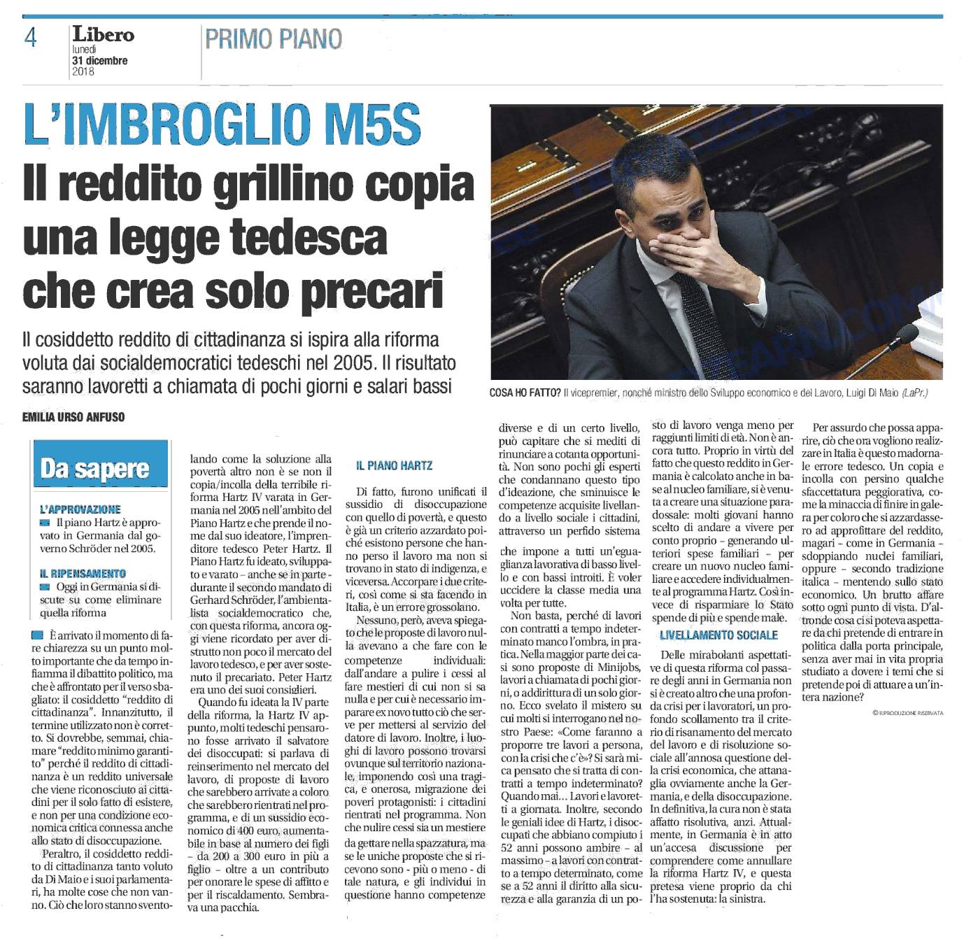 Su Libero in edicola lo scorso 31 Dicembre, è stato pubblicato un mio approfondimento in relazione al tanto sbandierato, e propagandato, “Reddito di cittadinanza” fortemente sostenuto dal M5S e dal suo elettorato. In fondo a questo articolo, l'immagine dell'articolo in questione. Non è la prima volta che tento di spiegare agli italiani, attraverso i miei articoli, che questa misura non è affatto la panacea dei mali di chi versa in condizioni economiche disastrose e di chi è disperatamente alla ricerca di un posto di lavoro che torni a dare dignità a padri e madri di famiglia, a giovani e meno giovani. Le ragioni per cui questa misura non è risolutiva ma, anzi, peggiorativa della condizione di milioni di italiani, le dà la stessa Germania che varò, nel 2005, la riforma Hartz IV, applicando – di fatto – la stessa misura che ora sta per essere introdotta nel nostro paese. Peccato che, a distanza di 13 anni dall’avvio in Germania di questa riforma, la stessa sinistra tedesca che l'ha fortemente sostenuta e varata, ora stia premendo affinché sia cancellata. Le ragioni sono semplici: non ha affatto promosso e sviluppato il mercato del lavoro, ma creato precarietà e disperazione, oltre a un sistema che impone ai tedeschi di accettare qualsiasi tipi di lavoro, anche per pochi giorni – i cosiddetti Minijobs – e spostandosi come ebrei erranti su tutto il territorio nazionale. Roba da brividi. Ora, ecco che in Italia si pretende di importare un grosso errore tedesco. Basta parlare con un po’ di cittadini tedeschi per comprendere la situazione reale, e ne avevo parlato in questo articolo pubblicato nel 2013: non è vero che la Germania è migliore dell’Italia. Oltre tutto questo, è necessario fare una riflessione: le condizioni preliminari esistenti in Germania nel 2005 erano del tutto diverse da quelle italiane attuali. I centri per l’impiego erano efficienti e vi erano impiegate il giusto numero di risorse atte ad avviare la riforma. Da noi, oltre il fatto che ora si pretenda di riformare i centri per l’impiego in circa due mesi, non avendo nemmeno chiaro in mente come assumere gli impiegati necessari a realizzare la riforma tanto cara ai grillini (tramite concorso? A chiamata diretta?) mancano le coperture necessarie a saziare l’intera platea di cittadini che, a buon diritto, potrebbero rientrare nel progetto. Non basta: a breve, per realizzare il reddito di cittadinanza, sarà sospeso il REI varato dal governo Gentiloni, a causa dell'entrata in vigore della riforma grillina. Tra coperture mancanti, centri per l’impiego da riformare, e una riforma che fa acqua da tutte le parti e che la stessa nazione da cui è stata interamente copiata sta tentando di cancellare, sarà interessante osservare come, probabilmente, le prime vittime di tutto questo bailamme saranno proprio i sostenitori più agguerriti: quella parte di elettorato che nel reddito di cittadinanza modello tedesco vedono la soluzione alla crisi economica e del mercato del lavoro, e quella parte di governo che ha fatto del reddito di cittadinanza il cavallo di battaglia politico, anche in vista delle elezioni europee. Nel frattempo la popolazione nazionale di classe media soffoca, affossata da un sistema politico che ormai – palesemente – è interessata solo a pavoneggiarsi e a dimostrare che “il cambiamento è iniziato”. Peccato che non abbiano chiarito di quale cambiamento stessero parlando…