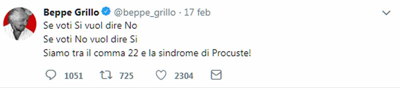 Era il 17 Febbraio, e sul profilo ufficiale su Twitter di Beppe Grillo è apparso un Tweet che citava la sindrome di Procuste. Il comico, o chi per lui dal momento che non è mai stato chiaro se quanto pubblicato sul suo profilo sia realmente vergato dal cabarettista genovese, ha utilizzato come esempio questa sindrome, misconosciuta ai più, riferendosi al referendum organizzato dal M5S sulla piattaforma Rousseau, con lo scopo di far decidere agli iscritti le sorti del nostro Ministro degli Interni Matteo Salvini sul caso della Nave Diciotti.