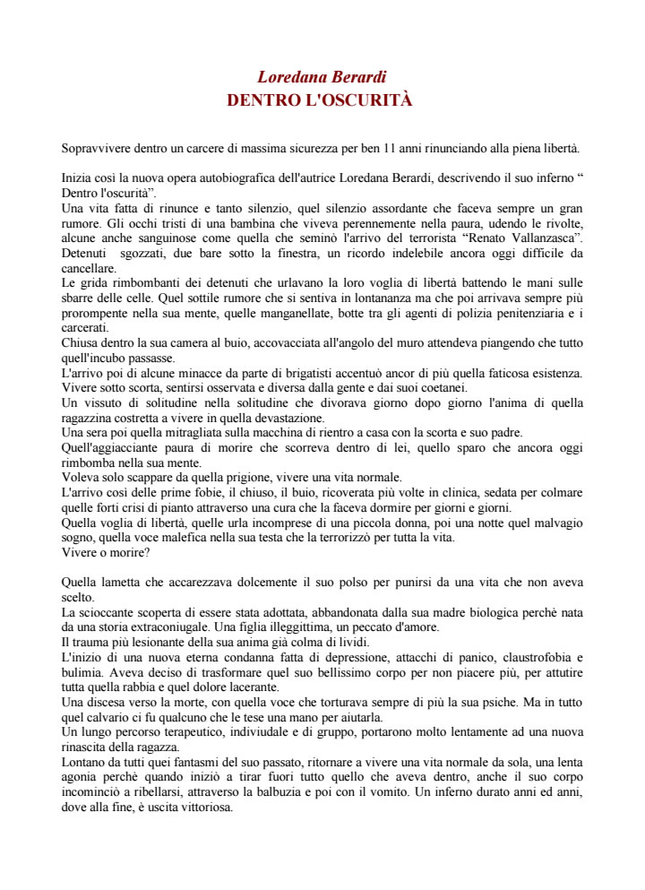 Loredana Berardi scrive per varie riviste e quotidiani. Ha esordito nel 2002 con il romanzo Un angelo accanto, seguito da La tempesta dell’anima, presentato nel 2015 al Salone Internazionale del Libro di Torino. Alcuni suoi racconti sono apparsi in varie antologie. Oggi collabora con la rivista online mondospettacolo. ACQUISTA IL VOLUME SUL SITO DELLA CASA EDITRICE