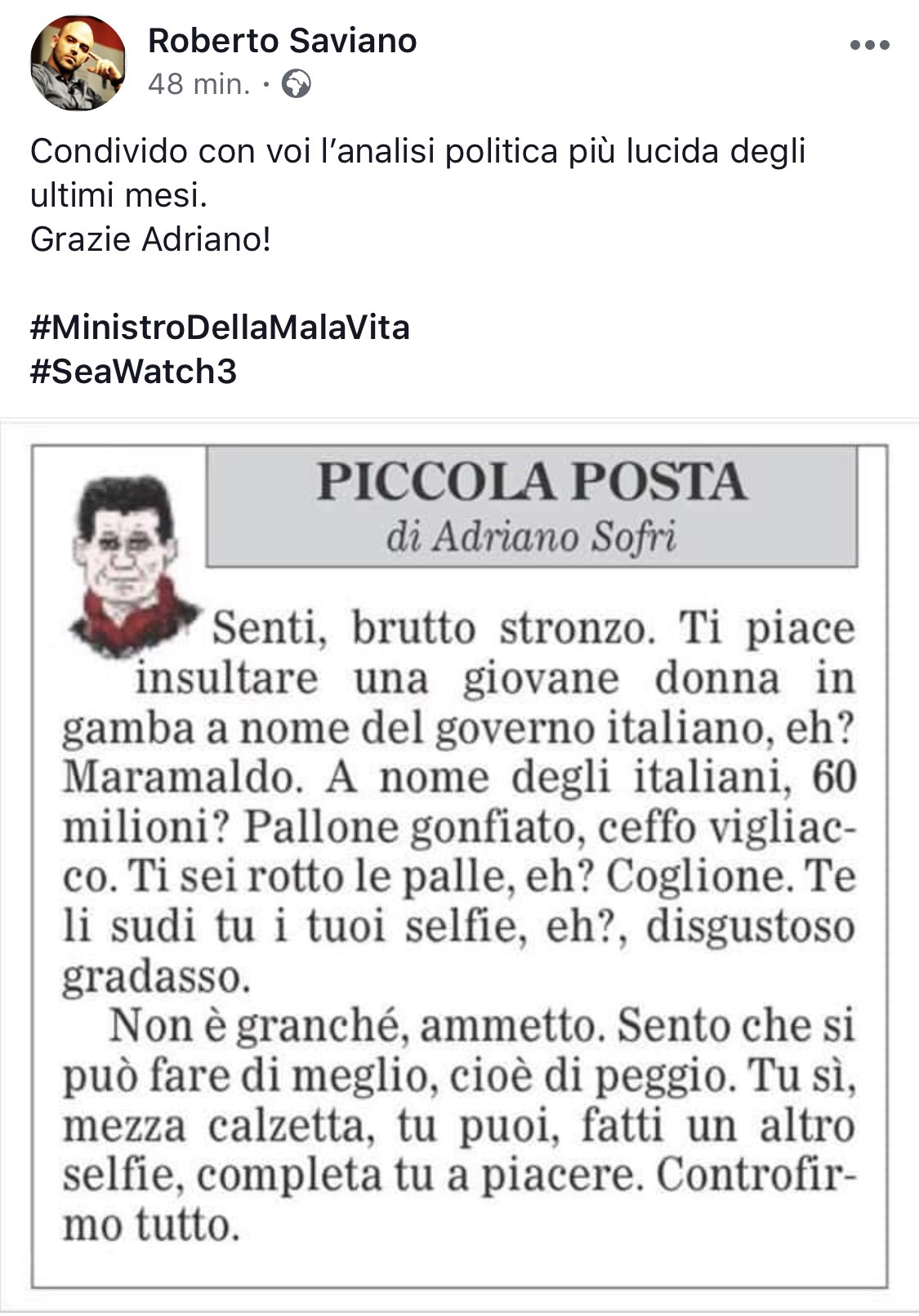 Coloro che si appellano a una sentenza della Cassazione dello scorso anno, quella attraverso la quale fu archiviata la denuncia di una ragazza romana, pesantemente offesa da un ex amico sui social, non deve affatto far trionfare, quanto riflettere anche sulla superficialità attraverso la quale anche la giustizia stia remando contro ogni coerenza. La sentenza ammette le ingirue subite, e non solo: che volete che sia, se sui social, ci si sfoghi un poco? A questo siamo arrivati. A un sistema talmente andato alla malora, da dover presupporre che esistano sfogatoi di rabbia popolare: i social. Esiste un articolo del codice penale – il 595 – che prende in esame proprio questo tipo di reato: la diffamazione a mezzo social. Proprio il fatto che su un social network le offese possono esser lette da un numero molto alto di persone, aumenta il danno nei confronti della vittima. Se questo lo chiamate “società moderna”, se la considerate civiltà evoluta, state sbagliando e di grosso. Non è alzando i toni, non è comportandosi da trogloditi ignoranti che si compone una società civile. E se l’inciviltà la preferite alla civiltà, assumetevene i rischi. Dalle parole ai fatti il passo è breve. E se oggi vi appare innocuo usare il turpiloquio contro gli esimi sconosciuti incontrati virtualmente, domani dovrà per forza apparirvi normalissimo comportarvi nella stessa maniera con chi incrociate per strada. Fermatevi, perché forse siete ancora in tempo. Forse. Ma non ne sono certa: questo è ciò che ha prodotto un certo tipo di “cultura”. Quella dei Vaffa Day e della confidenza presa senza esser stata concessa. Mai avrei pensato che si arrivasse a tanto. Sui personaggi politici si può pensare come meglio si crede, ma arrivare a questo no, mai. Il male continua a essere banale. Ma non va banalizzato. Mai. Mi fanno ridere quelli che fanno un gran bordello per certi titoli su Libero: poi, però, non guardano al vero problema. Gli attacchi hater, le insolenze, quelle reali, l'aggressività profusa ormai contro ogni persona, ogni personaggio politico, ogni sconosciuto, per il solo fatto di averlo li, a portata di mano, sul monitor di un PC. E' arrivato il momento di smetterla. Ecco a che livello siamo arrivati: è ammissibile? No. Questo tweet è indirizzato a Matteo Salvini.