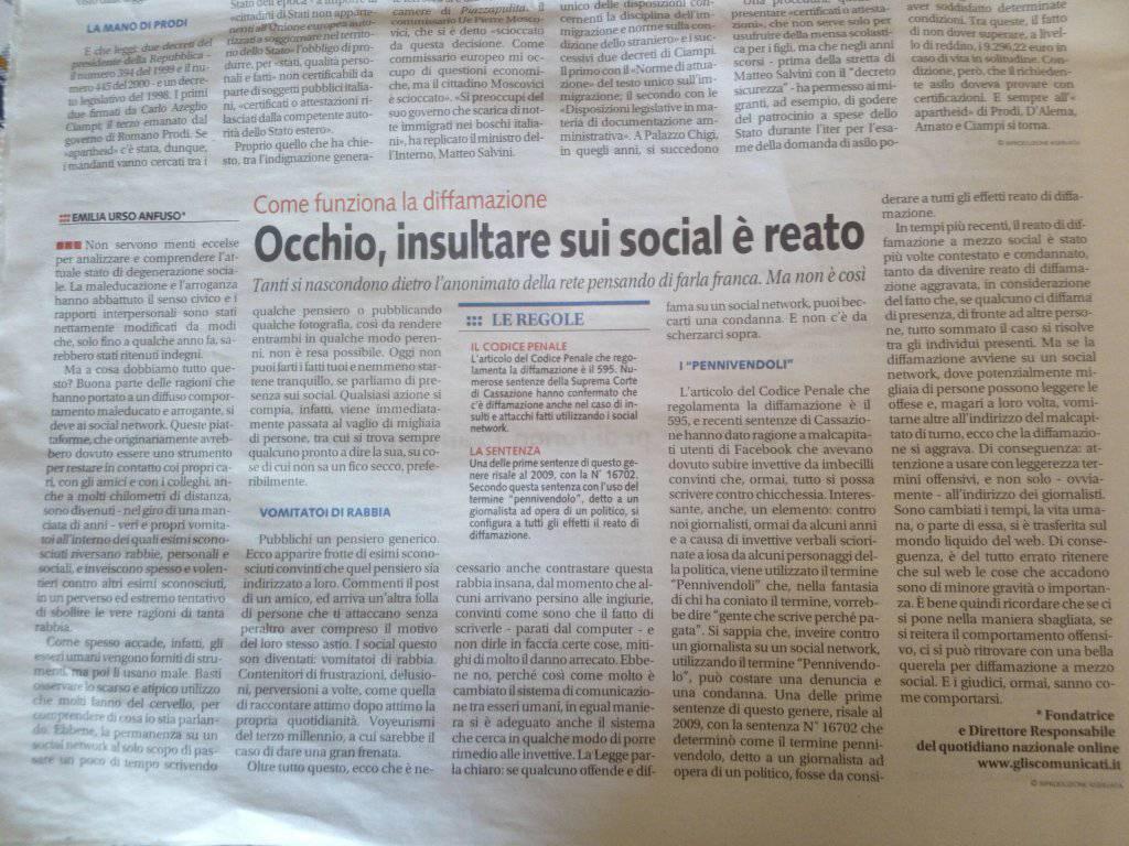 *questo articolo è dedicato a coloro che si comportano come descritto di seguito. Coloro che non si permetterebbero mai indecenze simili non si sentano offesi. ******** A qualcuno potrebbe sembrare esagerato quanto sto per scrivere, e il fatto che possa accadere davvero è la conferma che siamo arrivati oltre il limite consentito. Ingiurie, offese, parolacce. Dalla tv ai social network. Sono calati i filtri, quei filtri che in troppi considerano “fuori moda”. Come se il diventare volgari e maleducati oltre il consentito possa esser considerato “moderno” o frutto di una società evoluta. Cari miei: siete tornati di molti passi indietro nel percorso dell’evoluzione. Vi comportate come trogloditi incapaci di contenere ogni emozione e sentimento, in special modo se si tratta delle peggiori manifestazioni. Avete necessità di addentare, virtualmente, carne dei vostri simili, per poi sputarla oltre i confini del monitor del vostro PC o del vostro Smartphone, prolungamento incivile del vostro cervello. Chi pensa che il filtro di uno schermo consenta la possibilità di uscire da qualsiasi binario di civiltà è incivile a prescindere. Non catalogabile a livello umano. E se nessuno porrà un freno a questa china, a breve saranno sovvertite tutte le regole della civile convivenza. Invece di un “Buongiorno” attendiamoci un “Vaffanculo”. Al posto di un “Ti amo” un bel “Quanto fai schifo”. Non scherziamo, cortesemente. Questo è un manicomio. E non scherziamo nemmeno con la legge, dal momento che palesemente in pochi la conoscono. Tempo fa uscì un mio pezzo su Libero proprio sull’argomento delle ingiurie e offese proferite sui social. Ecco l’immagine dell’articolo: