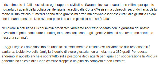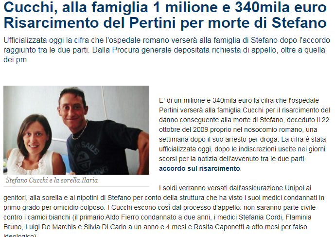 A questo punto giudicate voi: si trattò di risarcimento del danno – e quindi ammissione di colpa? – oppure si concordò una sorta di compenso per garantirsi l’immunità? Sta di fatto che il primario dell’ospedale Pertini, Aldo Fierro, e altri tre medici sono stati prescritti dal reato di omicidio colposo, mentre un quinto medico – Stefania Corbi – è stata assolta “per non aver commesso il fatto”. A voi, ora, la sentenza finale su tutta la vicenda. Mi fido della vostra capacità critica. ©Tutti i diritti riservati. La diffusione è concessa esclusivamente indicando chiaramente il nome dell'autore e il link che riporta a questa pagina