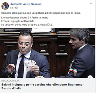 Non basta, ecco altre dichiarazioni della sardina: "Riina continua ad essere uno schifoso mafioso, Mussolini uno schifoso criminale, Buonanno uno schifoso razzista. Vita o morte che sia" ma ne ha anche per chiunque osi criticarlo sui social, a cui risponde con le parole di una canzone dei 99 Posse, band rap/rock napoletana:"C'ho il rigurgito antifascista, se vedo un punto nero ci sparo a vista". Viva l'anti-violenza delle sardine, abbasso l'odio di Salvini e dei leghisti. Questo è il livello di pacifismo attraverso il quale le sardine intendono modificare il sistema paese, che a loro parere è stato distrutto dalla violenza (...) di poltici quali Matteo Salvini. Complimenti per aver adottato un metodo pacifico talmente sottile che forse non siamo preparati a vederne i contorni... |