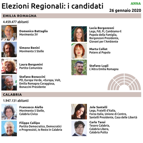 Seggi aperti dalle ore 7 alle 23, per eleggere il presidente della Giunta e i componenti dell'Assemblea legislativa in Emilia Romagna e in Calabria. Le operazioni di scrutinio avranno inizio a partire dalle ore 23.00 di domenica, subito dopo la conclusione delle operazioni di voto e l'accertamento del numero dei votanti. Saranno complessivamente quasi 5,5 milioni gli elettori. IN EMILIA ROMAGNA - oltre 3,5 milioni di cittadini saranno chiamati al voto per eleggere il presidente della Regione e i componenti dell'Assemblea legislativa; gli elettori sono per l'esattezza 3.515.539 di cui 1.707.781 uomini e 1.807.758 donne. Sono 4.520 le sezioni in cui sarà possibile votare, 4.520 seggi nei 328 comuni. Sono sette i candidati alla presidenza della Giunta della Regione (uno in più della precedente tornata) sostenuti da 17 liste (più 6 rispetto al 2014). Mentre 739 candidati (in crescita rispetto al 2014 quando furono 507) sono in corsa per uno dei 50 posti nell'Assemblea legislativa (di questi due seggi sono riservati al presidente eletto e al candidato presidente secondo classificato). Il 51% dei candidati consiglieri è di sesso maschile, tra tutti l'età media è di 46,9 anni (in crescita rispetto a cinque anni fa, quand'era di 45,5 anni) e per 6 sui 10 di loro la sfida alle regionali è la prima esperienza elettorale. IN CALABRIA - sono circa un milione e 800 mila gli elettori aventi diritto al voto nella regione. Sono 4 gli sfidanti: Jole Santelli, per la coalizione di centro-destra (Forza Italia, Lega, Fratelli d'Italia, Unione di Centro, Jole Santelli Presidente e Casa delle Libertà); Filippo Callipo, coalizione di centro-sinistra (Partito Democratico, Io Resto in Calabria, Democratici e Progressisti); Francesco Aiello, (Movimento 5 Stelle, Calabria Civica) e Carlo Tansi, liste civiche (Tesoro Calabria Calabria Libera e Calabria Pulita). (Ansa)