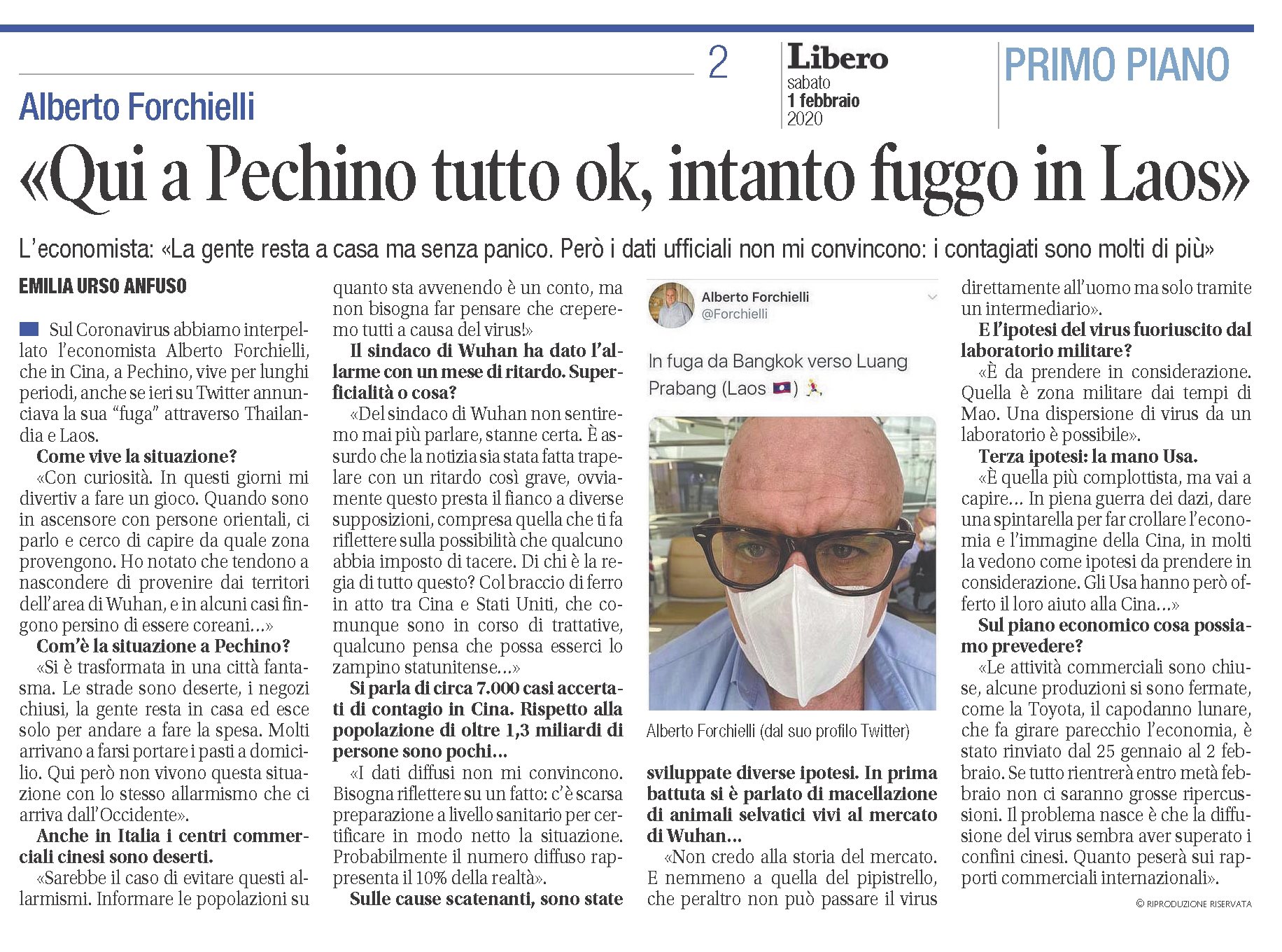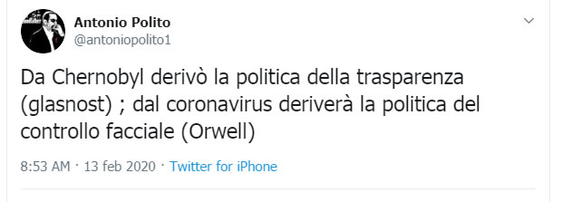 Il coronavirus, dopo aver aggredito i cittadini di mezzo pianeta, più che altro a suon di misure precauzionali e stampa internazionale, che – come ha egregiamente sintetizzato pochi giorni fa Mattia Feltri in un tweet scrivendo: Fighi noi dei giornali che facciamo dieci pagine sul #coronarvirus e la decima la titoliamo “Psicosi”– ha contribuito ad alimentare la psicosi a 360°. L’arrivo del festival di Sanremo è stato il vaccino contro una pandemia che, almeno da noi, esiste solo nella mente di molti cittadini. Di recente ho parlato al telefono col l’economista Alberto Forchielli, che mi ha telefonato dalla Cina dove vive per lunghi periodi, e abbiamo tratto da questa lunga conversazione l’intervista che è stata pubblicata su Libero: ecco l’immagine integrale Cos’è accaduto? Di chi è la colpa? Quanti sono i casi accertati reali? Perché il sindaco di Wuhan ha dato l’allarme con circa un mese di ritardo? Domande a cui non è facile dare risposta. Nel frattempo il governo italiano si è attivato alla grande, manco stesse per arrivare l’invasione extraterrestre : scansione della temperatura negli aeroporti – non so a cosa serva misurare la temperatura a tutti, dal momento che persone come me hanno una temperatura normale di circa 37° – blocco dei voli, dichiarazioni televisive da brividi e tutto l’armamentario tipico di quando, innanzitutto, si vogliono mostrare i muscoli. Un gruppo di italiani residenti a Wuhan sono rientrati e subito posti in isolamento – 14 giorni sono isolamento e non quarantena – poi si è deciso di protrarne il periodo. Due ricoverati allo Spallanzani, le cui condizioni si alternano secondo le dichiarazioni del giorno: “Stanno male, stanno bene, stanno male, stanno così così”... In Cina, nel frattempo, mentre dalle nostre parti si spendono energie per dimostrare al mondo che a livello di messa in sicurezza degli italici confini non abbiamo nulla da invidiare a nessuno, hanno costruito un paio di strutture ospedaliere, nulla di fantascientifico sia chiaro, ma lo hanno fatto in meno di una settimana, e attualmente vi alberga un buon numero di cinesi presumibilmente affetti dal coronavirus. Il mondo ovviamente non si è fermato, e la politica fa il suo corso, anche se all’italiano medio, affetto da patologia psichica riconducibile alla multipersonalità, preso da riflessioni da esimio virologo, interessava meno di un fico secco, anche se la gravità di quanto sta per arrivargli addosso è di certo peggiore della mera possibilità di beccarsi un malanno polmonare transitato per via aerea, o per mare, dalla Cina all’Italia. Il Conte bis è a caccia di soldi. Servono 15 miliardi, da trovare in tutta fretta per avviare la riforma fiscale tanto propagandata, e che dovrebbe portare – secondo le ipotesi non avallate dai fatti – all’agognata semplificazione. Niente di spettacolare, almeno per quanto ne sappiamo fino a oggi. Si tratterebbe di ridurre gli scaglioni reddituali da 5 a 3, copiando il modello tedesco da cui copiamo un mucchio di cose, le peggiori, come il reddito di cittadinanza. Non sarà facile trovare le coperture però, e ai controlli sempre più serrati in tema di evasione fiscale contro i piccoli contribuenti, già si parla di nuove e più potenti misure. Cosa voglio intendere con tutto quanto ho scritto? Semplice: stiamo assistendo alle prime prove generali della storia dell’umanità per ciò che riguarda il blocco dei confini e a livello internazionale. La paura di ammalarsi e morire fa un effetto tale che, se un giorno dovessero decidere di bloccare tutti, saprebbero come fare. Il collega Antonio Polito, stamane su Twitter, ha scritto questo tweet che dovrebbe essere memorizzato da tutti: Da Chernobyl derivò la politica della trasparenza (glasnost) ; dal coronavirus deriverà la politica del controllo facciale (Orwell): nulla di più reale.