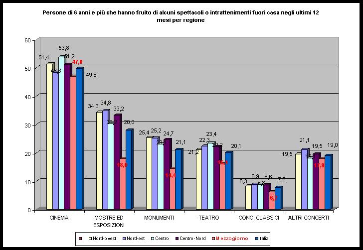 I residenti nelle regioni del Sud dichiarano di fruire di intrattenimenti culturali meno dei connazionali di altre aree del paese e in misura inferiore alle medie nazionali: cinema 47% (media Italia 49,8%); teatro 16,1% (20,1); monumenti 14,4% (21,1); concerti classici 6,2% (7,8%), mostre ed esposizioni 18% (28%)
