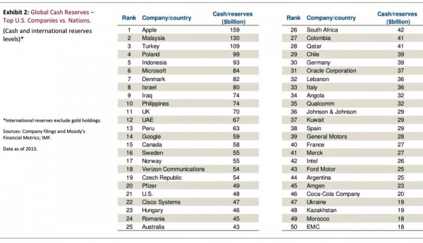 Le principali aziende statunitensi hanno più liquidità della maggior parte degli Stati del mondo. Anzi, Apple è più ricca degli Stati Uniti, del Regno Unito e della Germania, e i 159 miliardi di dollari che ha in cassa sono abbastanza per superare di oltre 4 volte la disponibilità di denaro dell'Italia. Il dato emerge da una relazione pubblicata dallo US Trust, l'equivalente del nostro Ministero del Tesoro, in cui si può vedere una tabella che confronta la liquidità di cassa delle maggiori aziende statunitensi e la disponibilità di denaro di alcuni Paesi. In particolare, Apple, Microsoft, Google, Verizon Communications e Pfizer, ossia le prime quattro in classifica, che nel 2013 hanno accumulato 404 miliardi di dollari di liquidità, superando persino le riserve monetarie di tutta l'eurozona, che ammontano "solo" a 221 miliardi di dollari. La relazione è un po' tendenziosa perché tiene conto solo delle riserve di denaro contante, senza mettere in conto titoli di stato, riserve auree e altri elementi, ma fa comunque scalpore. Lo scorso anno, quando pubblicammo la stessa relazione, qualcuno affermò che non ha senso paragonare i capitali di un Paese a quelli di un'azienda. In realtà lo US Trust lo fa per dimostrare la solidità delle aziende statunitensi, e per sottolineare come la ripresa economica Oltreoceano sia ormai un dato di fatto. Non a caso Moody's ha usato questi dati per far notare che nel complesso le imprese americane avevano accumulato a fine 2013 1.600 miliardi di dollari in contanti. Il dato non solo è in crescita del 12% rispetto a un anno fa, ma è anche quasi il doppio di quello passato agli annali nel 2008. Insomma le aziende statunitensi hanno ricostruito le loro posizioni di liquidità fino a raggiungere e superare i livelli pre-crisi. Sarebbe bello sapere se anche per quelle italiane è così.