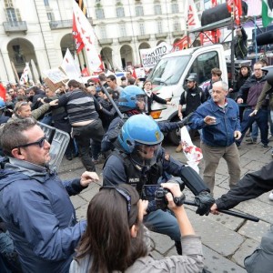 A farla esplodere la presenza, nella parte finale del corteo, di una delegazione del Pd e con questa il senatore Stefano Esposito, favorevole alla Tav. Dinanzi a loro sfilano i comitati No Tav e gli antagonisti, che non appena si accorgono della presenza del senatore, cominciano ad opporvisi, invitandolo ad allontanarsi. La tensione non cala nonostante le forze dell’ordine si frappongano fra i due gruppi ed evitino un primo contatto. Infatti gli antagonisti e i No Tav hanno tentato di forzare il cordone della polizia, ma le forze dell’ordine hanno risposto tenendoli distanziati dal corteo grazie all’utilizzo degli scudi. Le cose non potevano che peggiorare e dopo un pezzo di strada fatto in tranquillità, la tensione è cresciuta quando, vicino a via Roma, al grido “fuori il Pd dal corteo”, gli antagonisti hanno cominciato a scontrarsi di nuovo con le forze di polizia, provando a venire in contatto con la parte finale del corteo. Scontri e contatti si sono avuti anche in piazza Vittorio, dove un uomo è stato fermato per aver lanciato contro le forze dell’ordine alcune sedie. Il bilancio è di tre fermi, e sette agenti feriti. Al corteo striscioni anche contro le forze di polizia per il caso Aldobrandini, soprattutto dopo che nei giorni scorsi gli stessi agenti sono stati applauditi dai colleghi nonostante la condanna ricevuta per la morte del giovane. Ad essere contestati durante il corteo, anche la sentenza della Cassazione da parte dei familiari delle vittime della Thyssen, nel corteo per ricordare i sette operai morti nell’acciaieria torinese e per chiedere più tutela per i lavoratori. Ma non solo, contestati anche Chiamparino e l'ex presidente della Val di Susa Ferrentino, colpevoli di non aver fermato i lavori della Tav. Le opposizioni non si fermeranno qui, perché gli autonomi hanno lanciato una mobilitazione internazionale per l’11 luglio, quando Renzi sarà a Torino per il vertice europeo sulla disoccupazione giovanile.