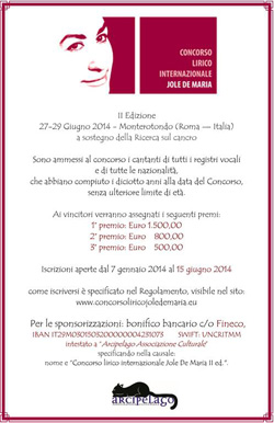 Non solo musica ma anche sociale, durante le tre serate, infatti, raccoglierete fondi per la Ricerca sul cancro, come nasce l’integrazione tra arte e solidarietà? L'Associazione culturale Arcipelago, della quale sono tra i soci fondatori, si occupa sin dalla sua fondazione di organizzare spettacoli al fine di raccogliere fondi per la Ricerca sul cancro. Inoltre, Jole De Maria è morta nel 2007 proprio a causa di questa patologia, quindi l'abbinamento Concorso lirico-Ricerca sul cancro è stato spontaneo. |
