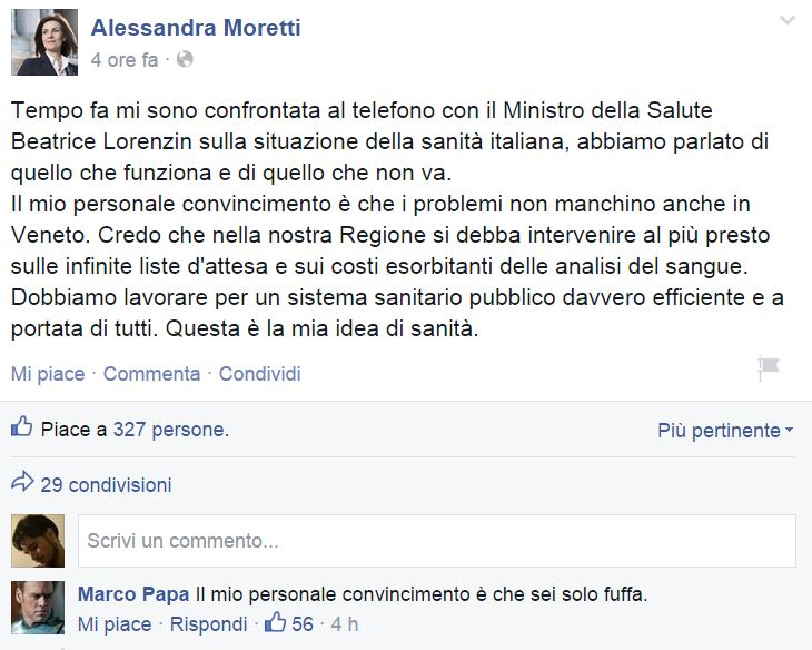 Galeotto fu il Social Network, su cui ormai si riversa quasi la totalità dei commenti poltici da parte di personaggi istituzionali. I fatti: la candidata del centrosinistra alle regionali in Veneto, Alessandra Moretti, aveva pubblicato il seguente post sul suo profilo Facebook "Il Ministro della Salute Beatrice Lorenzin mi ha chiamata personalmente per dirmi che la situazione della sanità veneta è ormai allarmante. E lo sentiamo ogni giorno sulla nostra pelle: le liste d'attesa per una radioterapia non fanno che crescere, le analisi del sangue costano più nelle strutture pubbliche che in quelle private. Questa è la 'sanità eccellente' di Luca Zaia" Un post che però è rimasto visibile per un'ora soltanto, dal momento che a un certo punto...E' sparito. Cancellato. Sembra che, a monte della decisione di cancellare il post, vi sia stata una telefonata del Ministro Lorenzin alla Moretti, per sollecitarla a far cancellare il post che metteva in cattiva luce lo stato della Sanità in Veneto. Se così fosse, una vera e propria azione di propaganda statale. Sta di fatto che, dopo altre due ore, sul profilo Facebook della Moretti è apparso un nuovo post, stavolta molto smussato rispetto al primo: "Tempo fa mi sono confrontata al telefono con il Ministro della Salute Beatrice Lorenzin sulla situazione della sanità italiana, abbiamo parlato di quello che funziona e di quello che non va. Il mio personale convincimento è che i problemi non manchino anche in Veneto. Credo che nella nostra Regione si debba intervenire al più presto sulle infinite liste d'attesa e sui costi esorbitanti delle analisi del sangue. Dobbiamo lavorare per un sistema sanitario pubblico davvero efficiente e a portata di tutti. Questa è la mia idea di sanità". A sfatare i dubbi, è intervenuto il capogruppo della Lega Nord Massimiliano Fedriga che, intervistato dal quotidiano Il Giornale ha dichiarato: "Quando ci sono dei disservizi, il ministro manda gli ispettori e non chiama un semplice cittadino come la Moretti che non è neppure parlamentare. La Lorenzin tra l'altro è a casa in maternità, non sta certo a pensare alla sanità veneta che è l'unica che rispetta tutti i parametri. La Moretti dovrebbe ricordarsi inoltre che se le analisi del sangue costano più negli ospedali pubblici che in quelli privati è perché il caro governo Monti, che il suo partito sosteneva, ha aumentato il costo minimo del ticket di tutti gli esami del sangue. Non è certo colpa di Zaia o della Lega". Malgrado queste spiegazioni però, i dubbi permangono e non sono positivi. In considerazione del fatto che in effetti la Moretti aveva pubblicato il testo poi cancellato, appare quantomeno bizzarra la marcia indietro e anche le dichiarazioni un poco vaghe del capogruppo della Lega. D'altronde, non sarebbe certo il primo caso di negazione della verità sulle situazioni politiche ed economiche che interessano il nostro paese.
