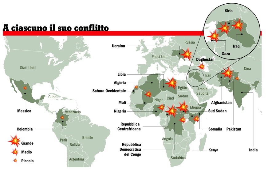 Le cronache delle testate nazionali, quelle collegate ai partiti politici e che quindi sciorinano più che altro notizie aderenti non tanto alla realtà dei fatti quanto alla propaganda politica, in questi giorni mettono in luce come, il numero dei migranti giunti in Europa nel solo mese di Luglio 2015, sia stato di 107.500 persone. 340.000 in totale nei primi sette mesi dell’anno contro i 280.000 registrati nei dodici mesi del 2014. La fonte di questi dati è Frontex. Si solleva la questione sull’aumento del numero dei migranti, così da diffondere a macchia d’olio un senso d’invasione dei territori europei, che non può far altro che creare un discutibile criterio di razzismo in molti cittadini UE. Discutibile, in quanto fondato esclusivamente su un senso di allarmismo generato solo sui numeri e non sulle motivazioni reali di ciò che sta accadendo in quei paesi in cui la guerra impone a molti di dover scegliere fra la vita e la morte, fra la libertà e la scelta se diventare prigionieri o, a loro volta, persecutori di altri esseri umani. E’ la storia di tutte le guerre: si può decidere se rimanere, e bisogna vedere in quale veste, o tentare di scappare. E’ accaduto durante la Prima e la Seconda guerra mondiale. E’ ciò che accade quando un conflitto è di lunga durata e coinvolge più nazioni. Con questo, non sto dicendo che dobbiamo accogliere senza se e senza ma, ma sto aprendo a un discorso che quasi nessun giornale approfondisce: quello relativo alla produzione e vendita di armi ai paesi in guerra e in special modo in Medio Oriente e in Africa. Quanti di voi sono a conoscenza del fatto che l’Italia produce ed è uno dei maggiori venditori di armi al mondo? Quanti di voi hanno riflettuto sul fatto che, i migranti che sono costantemente in fuga dai territori di guerra, sono anche – in qualche modo – vittime delle nazioni che vendono armi agli stati belligeranti? Da un lato produciamo e vendiamo armi, dall’altro – contemporaneamente – la politica italiana crea, a seconda dei casi, il “mostro” extracomunitario da respingere o la vittima da accettare sui nostri territori, senza però mai spiegare alla popolazione ospitante, in questo caso noi italiani, le motivazioni che sono alla base dell’accoglienza. Chi si ritiene maggiormente informato, tenta di spiegare il tutto attraverso l’applicazione dei trattati europei, come quelli di Dublino I, II e III, che normano le richieste di asilo politico da parte di extracomunitari in fuga da persecuzioni politiche e religiose o da paesi in guerra. O come gli accordi di Shengen, che regolano la libera circolazione delle persone all’interno dei territori delle nazioni firmatarie. Eppure, non è questo il punto. O non del tutto. Sono poche le persone che sono a conoscenza di tutti i conflitti attualmente in atto sul pianeta terra e, per ciò che riguarda l’Italia, nelle nazioni prossime al nostro territorio e ai nostri mari. Moltissimi italiani ad esempio, ancora oggi non sono in grado di capire che in Siria è in atto un conflitto annoso, ma – cosa ancor più grave forse – non sanno indicare dove si trovi la Siria. O la Libia. O il Mali. O il Pakistan… Guardate la cartina che segue, e scoprirete quanto vicine all’Italia siano certe nazioni: