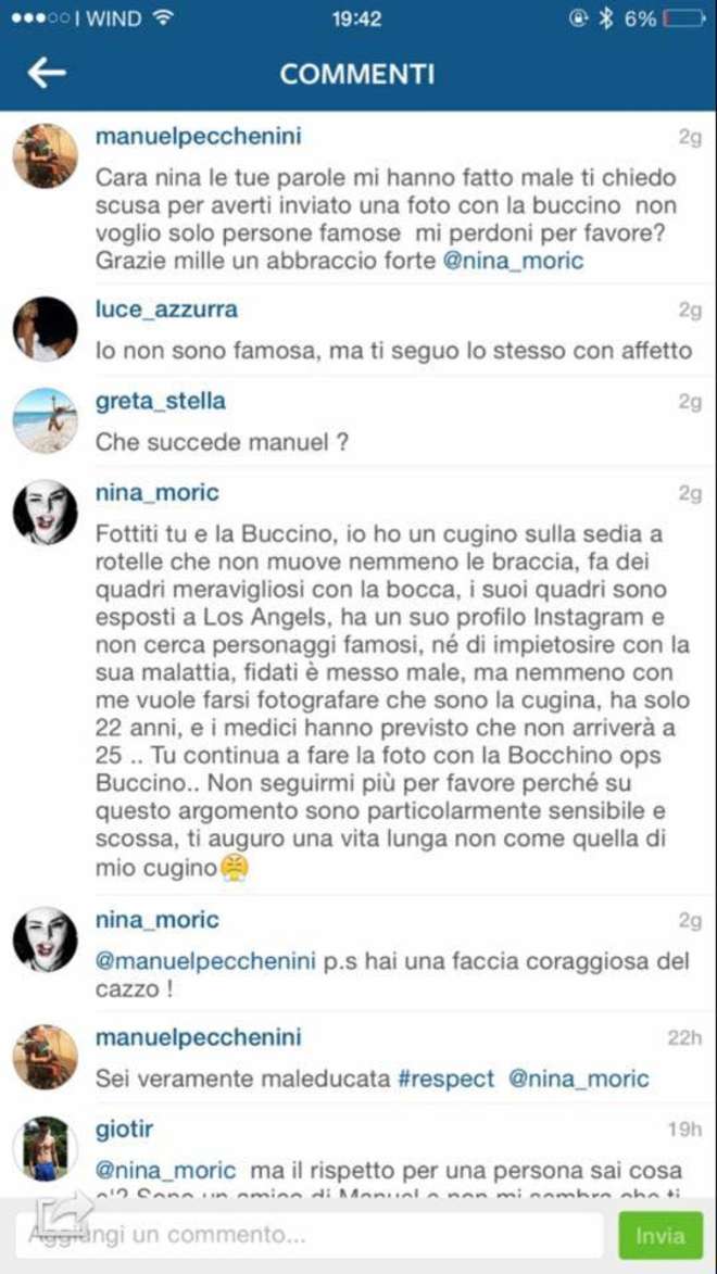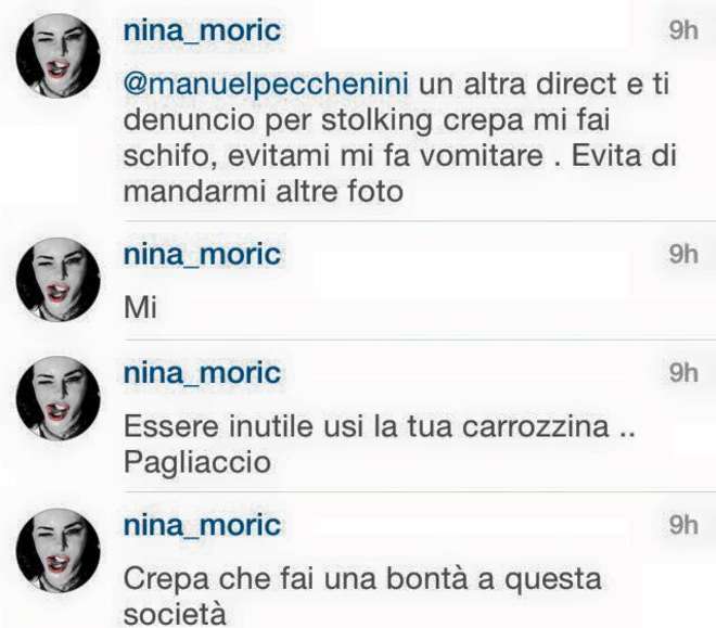 Sempre più spesso, gli scivoloni, le gaffe, le dichiarazioni miserevoli, vengono fatte attraverso i social network, luoghi divenuti ormai contenitori della realtà che non è più così virtuale. Quesra volta a "scivolare" è stata Nina Moric, ex consorte di Fabrizio Corona e modella. La Moric ha pensato bene di insultare pubblicamente su un social un suo fan disabile, "reo" di averle inviato per posta una foto che lo ritrae con Cristina Buccino. E' stata Selvaggia Lucarelli a sollevare la questione dopo avere realizzato uno screenshot dei commenti scambiati fra la Moric e il suo fan disabile. La Lucarelli ha scritto: «C'è un ragazzino su una carrozzina. Si chiama Manuel Pecchenini. Manuel scrive spesso a ragazze note, chiede una foto, chiede attenzione, lo fa con simpatia e insomma, direi che sul web è molto più educato di tanti trogloditi che camminano sulle loro gambe. E poi insomma, se queste sono le piccole cose che lo rendono felice, non starei a giudicare. Ha scritto anche a Nina Moric. Lei inizialmente gli ha mandato messaggi affettuosi, poi non ho ben capito, pare che Manuel le abbia mandato una foto in cui era con la Buccino e Nina è andata su tutte le furie. Lui ha provato a chiederle scusa. Quello che Nina gli ha risposto, tra un augurio di morte e altre frasi simpatiche anche per la Buccino». In pratica: Nina ha rivolto accuse pesanti al ragazzo accusandolo di volersi far compatire dalla rete e di usare la sua invalidità come tramite, ha offeso in modo molto pesante la Buccino e alla fine ha anche augurato la morte al povero fan. Insomma: la Rete toglie ogni tipo di remora. Non lascia spazio all'educazione. Rende le persone libere si, ma di vomitare atteggiamenti che, nel mondo reale, ancora sarebbero considerati inaccettabili.