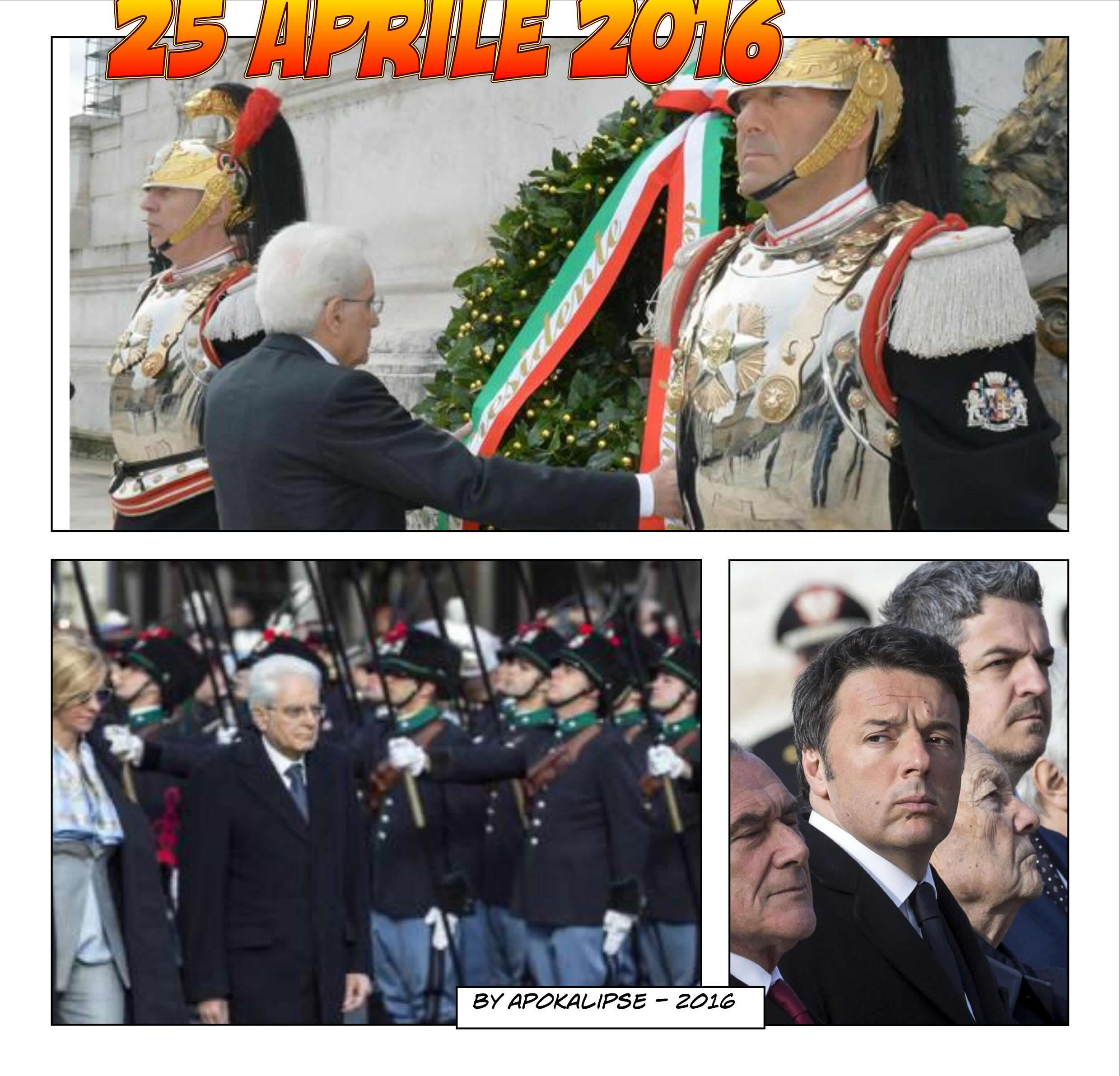 Stamane il Presidente della Repubblica, Sergio Mattarella, accompagnato dal Premier Renzi, dal presidente del Senato Piero Grasso, dal vicepresidente della Camera Simone Baldelli, dal ministro della Difesa Roberta Pinotti e dal presidente della Corte Costituzionale Paolo Grossisi è recato presso l'Altare della Patria e ha deposto una corona d'alloro, per ricordare il 71° anniversario della Liberazione. |
