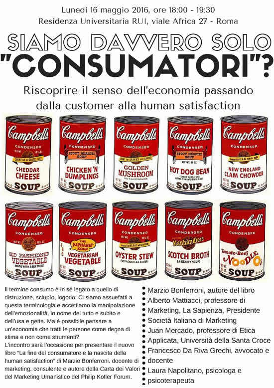 Il nuovo umanesimo per l'economia, le imprese e il marketing. Durante lincontro, verrà presentato il nuovo libro del Professor Marzio Bonferroni "La fine del consumatore" Il Professor Bonferroni è uno scrittore e docenteitaliano, è attivo soprattutto nell'ambito della comunicazione e degli studi di marketing.