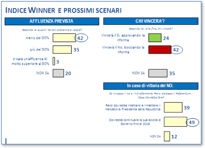 Due terzi degli italiani indicano come la riforma sia troppo complessa e poco chiara per sostenerla (proprio la scarsa chiarezza è identificata come uno dei maggiori pericoli di questa riforma, che crea confusione e potenziali conflitti nell’equilibrio dei poteri). Allo stesso tempo la campagna appare un referendum sul Premier: mancano i contenuti e molti lamentano uno squilibrio mediatico a favore del Governo.