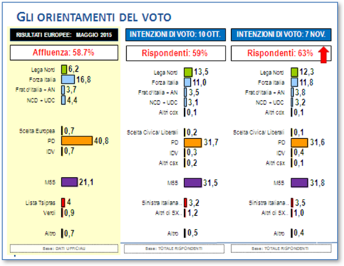 Scende la Lega (soprattutto in favore di FI che con Berlusconi è scesa fortemente in campo sulla partita referendaria) e continua a rafforzarsi il M5S. Per il momento, supportato anche dalla crescita del dichiarato di voto, tiene il PD, pur messo in crisi dalle divisioni interne e dalle tensioni nell’elettorato.