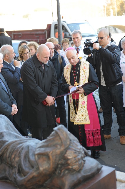 Sono state benedette oggi da Mons. Fisichella le opere iper-realiste realizzate dallo scultore canadese Timothy P. Schmalz e donate all’Ospedale Santo Spirito in Sassia della ASL Roma 1. Le due statue bronzee "Quando io ero ammalato" e "Quando io ero affamato e assetato" fanno parte di un unico ciclo artistico dedicato al Vangelo di Matteo, ideato e fuso in Canada in occasione del Giubileo Straordinario della Misericordia. Il ciclo comprende anche "Quando io ero nudo" (donato alla Basilica di San Pietro in Vincoli), "Quando io ero in carcere" (donato alla Basilica di San Paolo) e "Quando io ero straniero" (donato alla Basilica di San Lorenzo in Lucina). Foto: Monsignor Fisichella e Timothy P. Schmalz Al termine della cerimonia l’artista è stato invitato a sottoscrivere il Liber Fraternitatis Sancti Spiritus, la preziosa raccolta di rari autografi di coloro che hanno lasciato traccia del proprio passaggio e della propria adesione all'opera dell'Istituto di Santo Spirito. Presenti, oltre all’artista e a Mons. Fisichella, il Direttore Generale della ASL Roma 1, Angelo Tanese, il Direttore Sanitario, Mauro Goletti, e Don Andrea Manto.