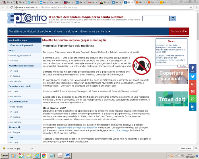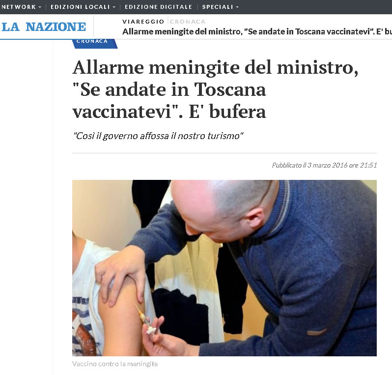E che dire di quando – lo scorso anno – se ne uscì con la barzelletta dell’epidemia di Meningite in Toscana, consigliando la vaccinazione a chi vi si recasse e scatenando un putiferio: ecco lo screenshot di uno degli articoli apparsi all’epoca, tante volte dovessero decidere di cancellare una parte di storia pubblicata
