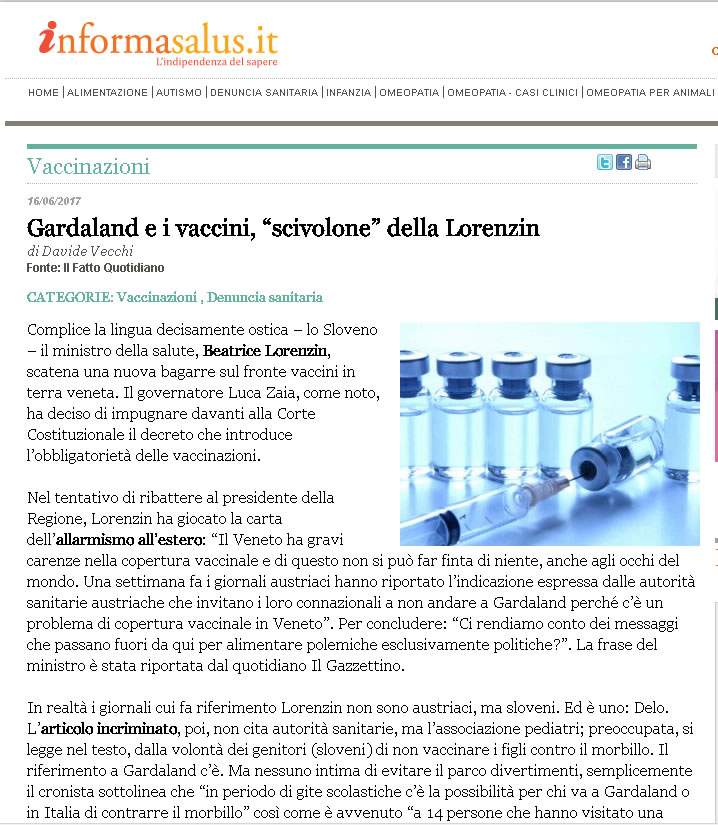 In questo mio editoriale pubblicato lo scorso 23 Maggio, denunciai appunto il tenore assolutamente autoritario del nostro Ministro della Salute. Rispondere alla domanda “Chi non può pagare”? con “Un motivo in più per accettare la vaccinazione, non doveva passare inosservato. Anche perché, in qualche modo, è una minaccia grave contro la povera gente, quella che al solo pensiero di dover trovare cifre mai viste tutte insieme nella vita, non può che far calare la testa, e l’ennesimo amaro boccone. Quindi: chi è ricco può scegliere? Chi ha denaro può far salvi i diritti civili? Ce lo spieghi, Ministro Lorenzin. Poi, ecco arrivare gli emendamenti: uno di essi, appena approvato in Senato, fa scendere di parecchio le sanzioni pecuniarie, che attualmente vanno da 100 a 500 euro. Piccola riflessione: inizialmente, il DL Lorenzin prevedeva sanzioni pecuniarie esagerate, e sono state utilizzate per spaventare le famiglie (vedi screenshot precedente). Considerando che ora è stato reso possibile un notevole abbattimento delle stesse, si palesa una volta di più il metodo incostituzionale ed autoritario utilizzato dalla Lorenzin, senza contare le persone che fin dai primi giorni del varo del decreto, sono corse a far vaccinare i figli, forse anche per scongiurare lo spauracchio del pagamento delle sanzioni... Inoltre, vige una situazione di totale caos: qual è il calendario vaccinale? Le famiglie sanno che il decreto è retroattivo e che quindi, i nati dal 2001 che non risultino immunizzati, saranno chiamati a vaccinarsi? Al di là di questi modi che indicare come autoritari mi sembra poca cosa, e al di là del caos che avviluppa questa vicenda, passiamo al “Decreto d’urgenza”, deciso dal governo per far passare immediatamente questo abuso di potere, e – contestualmente – questo regalo alle case farmaceutiche, tra cui spicca la tristemente famosa Glaxo, si, quella che aveva pagato ben 600 milioni di vecchie lire di mazzetta all’allora Ministro della Salute De Lorenzo, che infatti fu condannato a nove anni di reclusione e al pagamento di un bel po’ di quattrini. La cosa stupefacente? Malgrado lo scandalo di allora, il motivo centrale per cui De Lorenzo fu condannato – rendere obbligatorio il vaccino contro l’Epatite B, dietro pagamento di ricca mazzetta - non è stato affatto reso inefficace. Ancora oggi infatti, il vaccino contro l’Epatite B è obbligatorio, e fa parte di un altro scandalo: l’esavalente, la conferma cioè, che la popolazione non decide mai una minkia. Perché sebbene fino al recente decreto Lorenzin, le vaccinazioni obbligatorie erano solo 4 più due “consigliate”, i bambini hanno comunque subito l’inoculazione indiscriminata di 6 vaccini, a causa di un vaccino appunto esavalente, e a risposta dei dubbi di alcuni, è stato detto per anni che non esistono vaccini singoli, ma solo quello che ne contiene 6. Da rivoluzione, ma tant’è… A questo link, un mio articolo-inchiesta su Glaxo. Ora, torniamo ai giorni nostri. Una parte di popolo è già corsa a far vaccinare la prole: 12 vaccini gratis, vuoi mettere? Un “affarone”. Manco fossimo al supermercato. Giuro di aver letto, e sentito, dichiarazioni di questo tenore, da parte di madri che palesemente non riescono proprio a capire la differenza tra “Scelta libera e informata” e “far parte del gregge silenzioso”: “Finalmente! Io pago le tasse! E i vaccini che ho fatto fare ai miei figli non li ho pagati! Era ora”… Ecco, costoro non pensano affatto che – guarda caso – l’unica cosa immediata e gratuita del nostro ormai perso sistema sanitario, è la vaccinazione obbligatoria. Prova a chiedere di fare una Tac o un Holter cardiaco. Minino ti danno appuntamento tra un anno, ma i vaccini ci mancherebbe, corsia preferenziale, niente attese e tutto gratis. Un dubbio nemmeno se lo fanno venire. Il decreto d’urgenza, come dicevo, è già di per sé incostituzionale, visto che non siamo affatto in epidemia di morbillo o di meningite, e visto che, in mancanza di epidemia, questo decreto lede l’articolo 32 della Costituzione, che recita: La Repubblica tutela la salute come fondamentale diritto dell'individuo e interesse della collettività, e garantisce cure gratuite agli indigenti. - Nessuno può essere obbligato a un determinato trattamento sanitario se non per disposizione di legge. La legge non può in nessun caso violare i limiti imposti dal rispetto della persona umana. La legge non può in nessun caso violare i limiti imposti dal rispetto della persona umana. Appunto. Invece cosa ha firmato la Lorenzin? Un decreto d’urgenza in mancanza di urgenza, ha minacciato pubblicamente i genitori inadempienti, ha diffuso dichiarazioni anomale, come quando inventò di sana pianta che l’Austria minacciava di chiudere le frontiere in quanto a Gardaland vi era un aumento dei casi di morbillo, ecco uno degli articolo che distrugge queste anomale dichiarazioni proferite dalla Lorenzin: