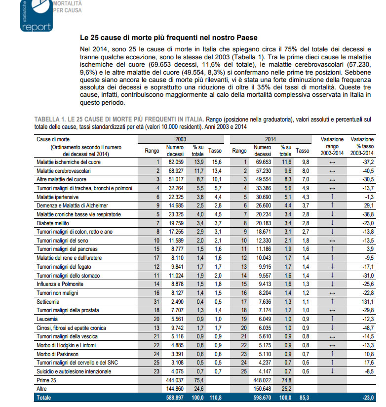 Ritengo che sia necessario riflettere attentamente su ciò che sta accadendo, di grave, nel nostro paese. Una nazione il cui sistema sanitario universale è negato ai cittadini, costretti – sempre più spesso – a rivolgersi alla sanità privata per curarsi o sottoporsi ad analisi e altro tipo di diagnostica, con le medicine per cui si paga il ticket e per cui, per alcune che fanno parte dei cosiddetti “salvavita” si è costretti a pagarle per intero, come nel caso – aberrante – del farmaco per la cura del tumore al polmone, che solo se hai soldi puoi acquistare perché il sistema sanitario non lo passa, per non parlare delle enormi carenze nei confronti di malati di SLA e di altre patologie gravi e invalidanti, ecco, in questo paese si rendono disponibili gratuitamente i vaccini. Resi obbligatori da un decreto Legge varato d’urgenza in mancanza di urgenza, in considerazione dell’enorme caos, anche mediatico, montato sui casi in aumento relativi prima alla Meningite, ora al morbillo. Peccato poi, che grazie a un emendamento presentato recentemente, scopriamo che l’epidemia di meningite doveva essere un falso di Stato, visto che i due vaccini contro la Meningite non sono più obbligatori, ma solo “consigliati”. Peccato anche, che si sia pensato all’introduzione di sanzioni pecuniarie, che fanno tanto divisione sociale tra ricchi e poveri: se paghi, puoi pure non vaccinare tuo figlio, sembra urlare questa misura. E meno male che, di emendamento in emendamento, si è giunti anche alla decisione di stralciare il punto in cui si blaterava di “togliere la potestà genitoriale” ai genitori inadempienti: manco in un film sul nazismo, si poteva pensare a cose del genere. Però, mentre si rendono disponibili in forma gratuita 10 vaccinazioni, su cui c’è molto da dire, al di là delle dichiarazioni “confortanti” da parte del Ministro Lorenzin – effettivamente poco titolata a parlare di vaccini, col suo diploma di Liceo Classico – e di altri forti quanto ambigui strenui sostenitori della vaccinazione a go go, poi si negano le cure e l'accesso ai farmaci a milioni di persone. E come la mettiamo con l'esistenza del “fondo vittime dei vaccini”? Un vero ossimoro istituzionale: da un lato dicono che i vaccini “sono sicurissimi”, dall’altro alimentano il fondo vittime dei vaccini. La coerenza non è cosa italiana. E meno male da un lato, perché ci consente di capire ancor meglio le azioni maldestre di chi, palesemente, è poco interessato alla salute della gente. La controprova? Facilissimo fornirla. Leggete questi dati: DECESSI IN ITALIA NEL 2016 per patologia I dati parlano chiaro: i decessi in Italia hanno altra natura patologica. Non si muore per le conseguenze delle malattie infettive, bensì per le complicanze del Diabete piuttosto che per le malattie cardiovascolari, per la dipendenza dal fumo e patologie connesse o per tumori di vario genere. I dati ufficiali dei casi di morte per patologia, li trovate a questo link: non troverete un solo caso di morbillo o varicella… Ecco la tabella che elenca le cause di morte in Italia:
