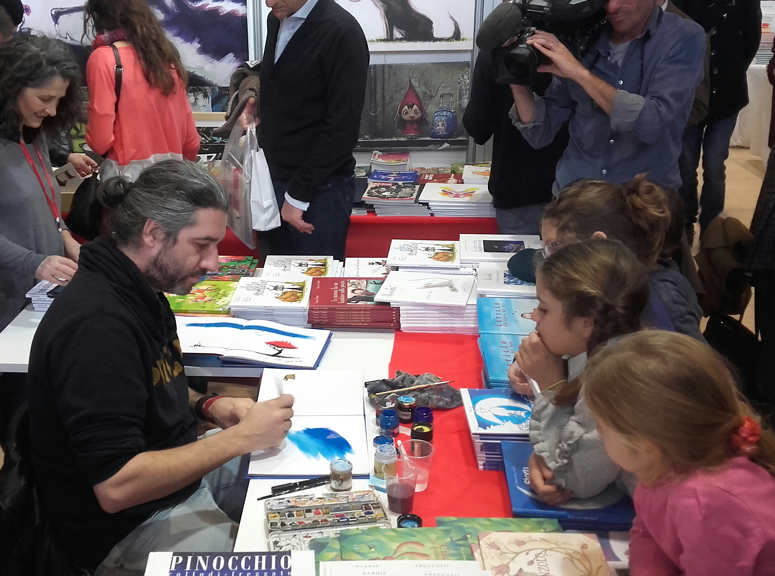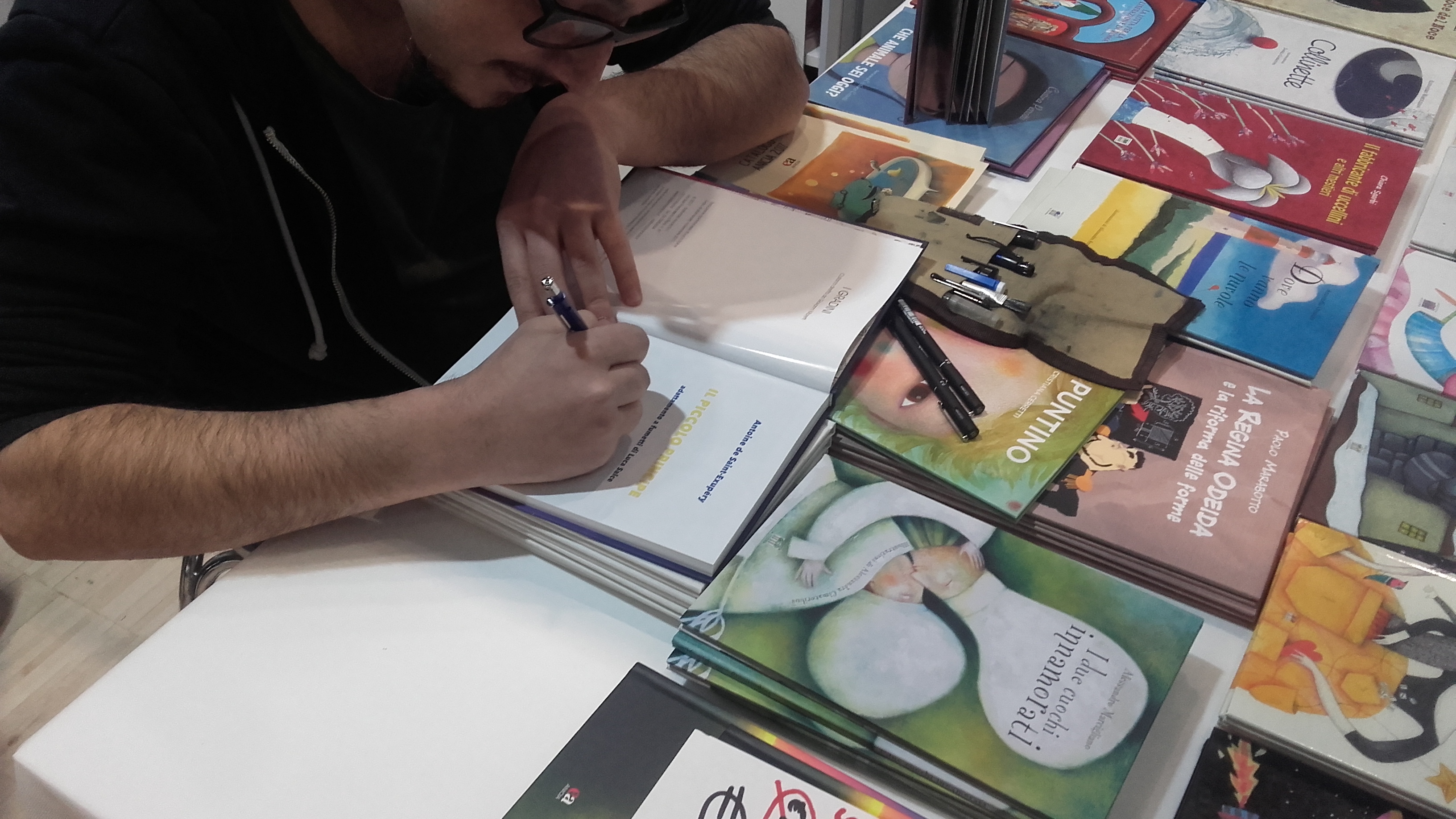 Fotografia della nostra inviata Susanna Schivardi Ho voluto ridare una versione davvero attinente all’originale perché è uno dei racconti più belli mai letti, con una filosofia profondissima che solo a distanza di anni si può comprendere”. Nel frattempo prende uno dei suoi volumi e inizia a disegnare una dedica “ho sempre disegnato, fin da piccolo, cresciuto con Paperino poi ho frequentato la Scuola Comics di Firenze. In Italia sto bene ma il vero sogno è la Francia dove gli illustratori sono trattati come veri artisti, i fumetti sono considerati alla stregua di veri e propri romanzi, non come qui dove questo lavoro non è ancora preso sul serio”. Il suo tratto è raffinato e deciso e dedica il volume ad una bambina che lo prende tra le mani estasiata e continua a leggerlo per tutta la giornata.