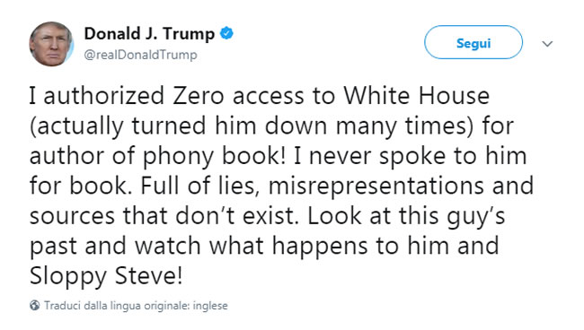 "Un imbecille, un idiota, un bambino": è quanto scrive il giornalista Michael Wolff nel suo libro-biografia su Donald Trump dal titolo "Fire and Fury". Nel suo libro Wolff racconta aneddoti sulla vita alla Casa Bianca del presidente USA, tra i più controversi e chiacchierati della storia statunitense. Wolff non tralascia nemmeno episodi che vedono come protagoniste la moglie di Trump, Melania e la figlia, Ivanka. Secondo Wolff, anche i familiari del presidente Trump hanno di lui una pessima opinione, additandolo come un "idiota". Il presidente Trump, per ovvie ragioni, ha reagito molto male al lancio del libro e al suo contenuto, ed è arrivato a parlare di se, descivendosi come "un genio" e - più in generale - come una persona in gamba e capace. A nulla poi sono servite le diffide di Trump a non pubblicare il libro che, anzi, sta ottenendo un notevole successo di vendite.