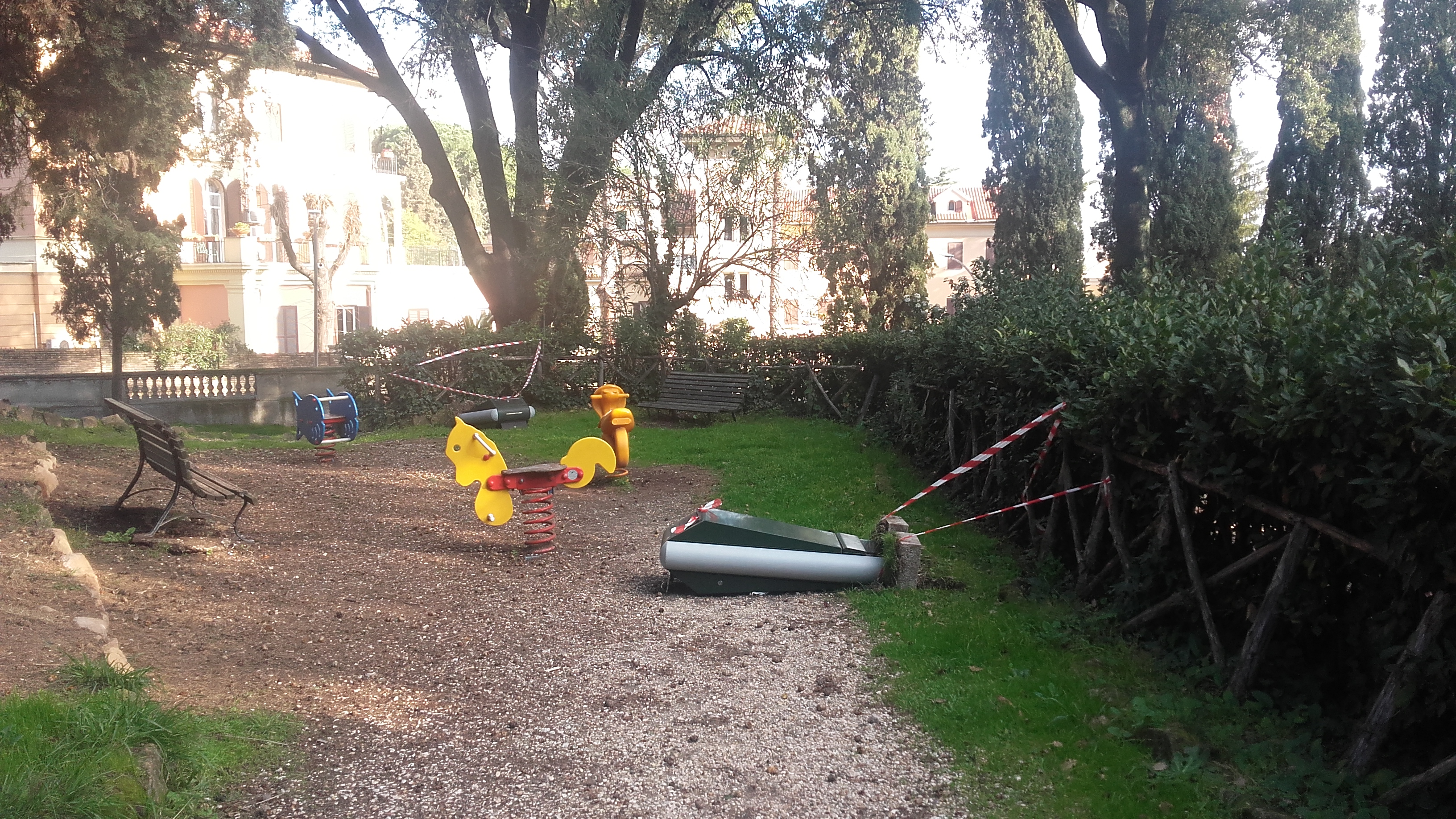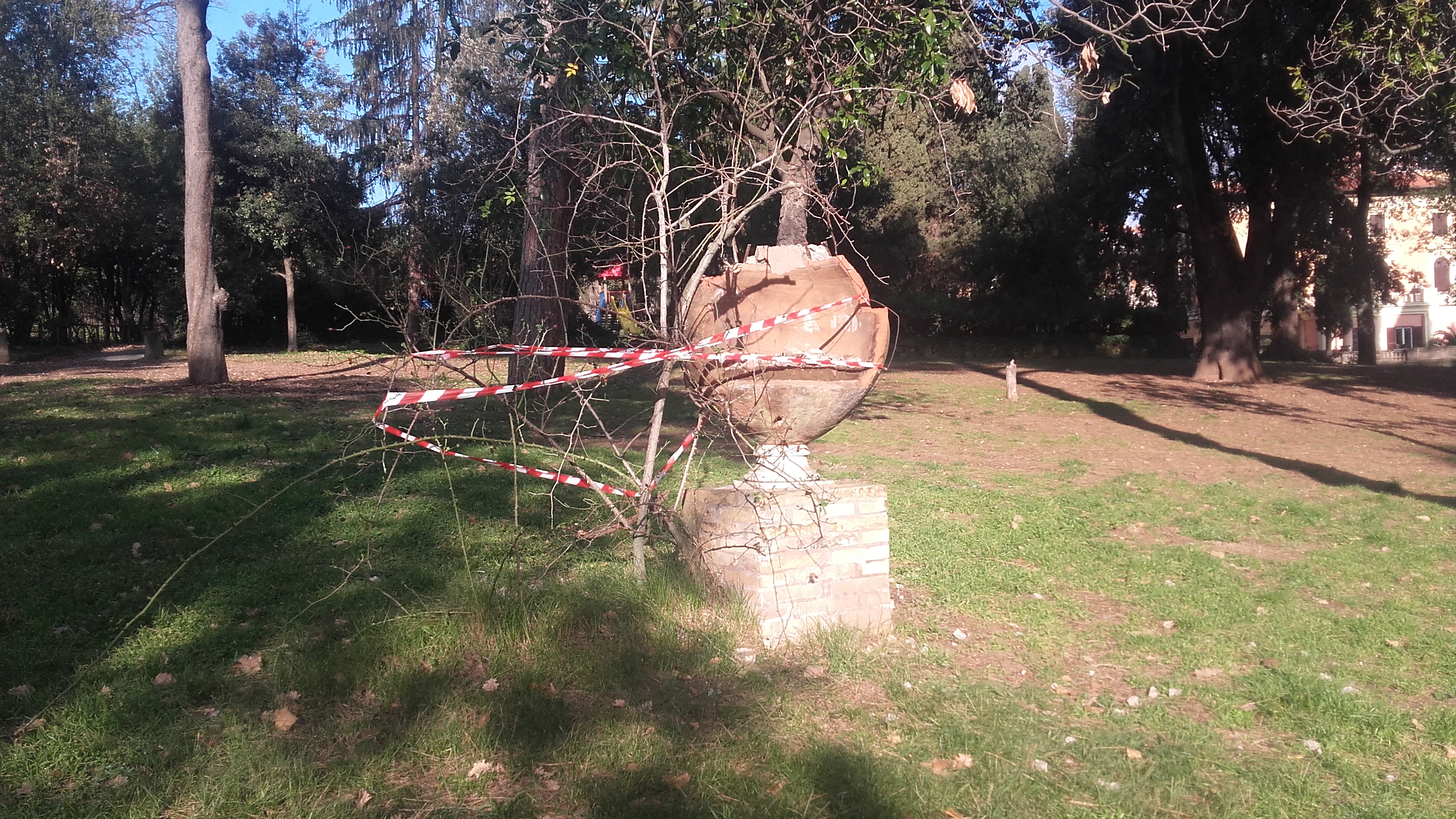 E’ accaduto domenica 4 febbraio, di notte: un gruppo di vandali, entrati all’interno di Villa Sciarra indisturbati, perché come tante ville di Roma, anche questa di notte rimane aperta, e hanno devastato tutto quello che si sono ritrovati davanti. Hanno divelto il piccolo scivolo dell’area giochi per bambini, hanno rovesciato i contenitori per deiezioni dei cani, i cestini per piccoli rifiuti, hanno rovesciato le bellissime olle, adesso contenute dalle bande bianche e rosse della sovrintendenza, hanno staccato e buttato nel laghetto il cane del complesso statuario lì presente.